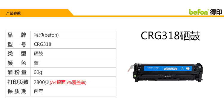 商品属性 [供应商] 深圳市云中鹤科技股份有限公司 [品牌名称:] 得印(befon) [商品型号:] CRG318 [商品sku编码:] 1125899907303585 [重量:] 0.88kg [产地:] 广东省中山市 [单位:] 支