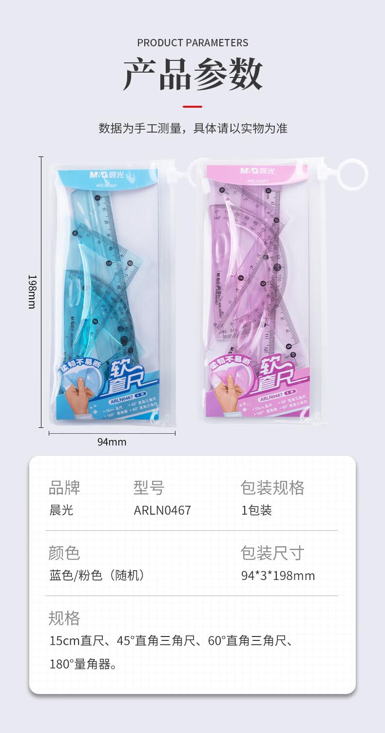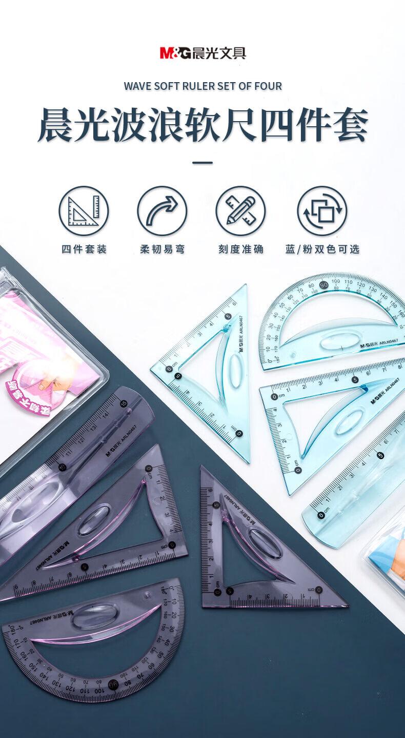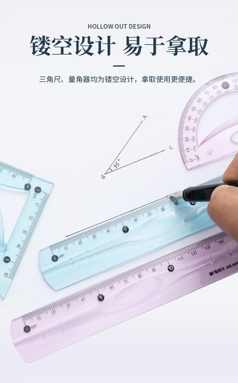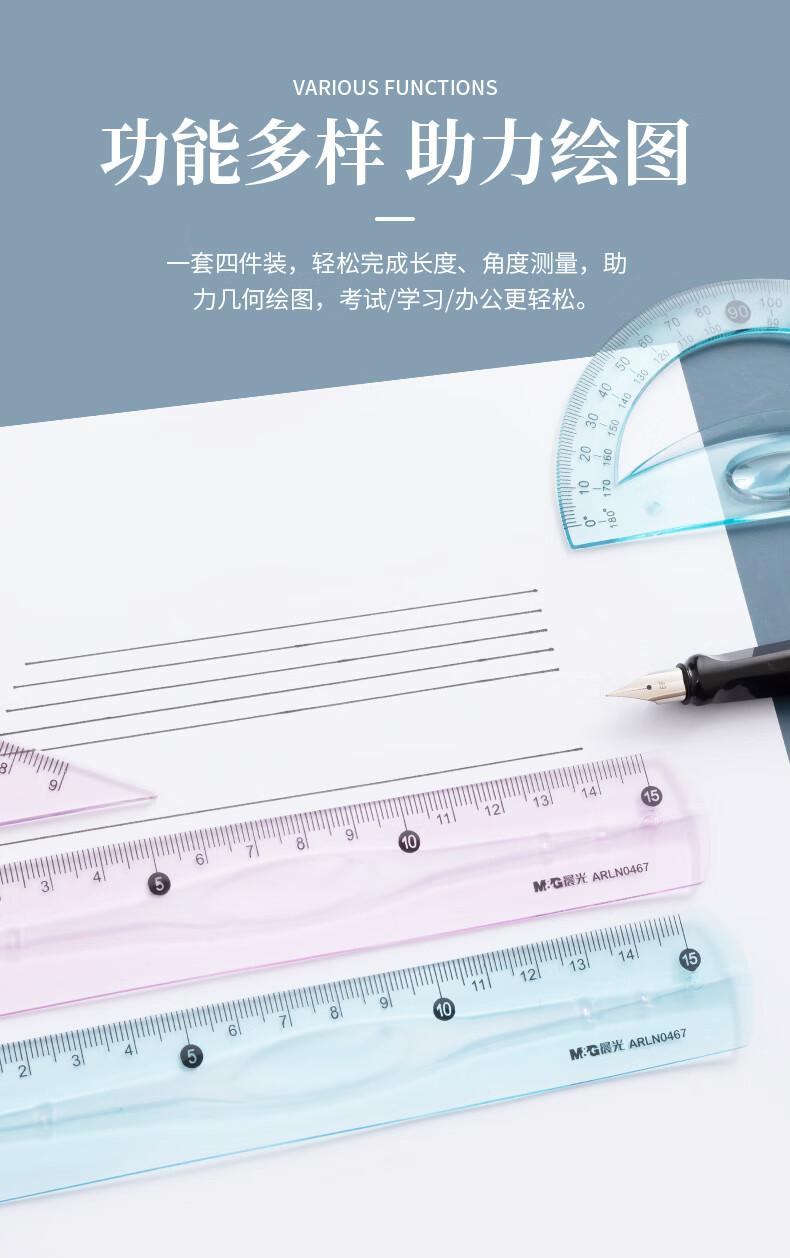 商品属性 [供应商] 深圳市怡亚通供应链股份有限公司 [品牌:] 晨光(M&G) [型号:] ARLN0467 [规格:] 直尺15cm+直角三角尺60°+直角三角尺45°+量角器180°