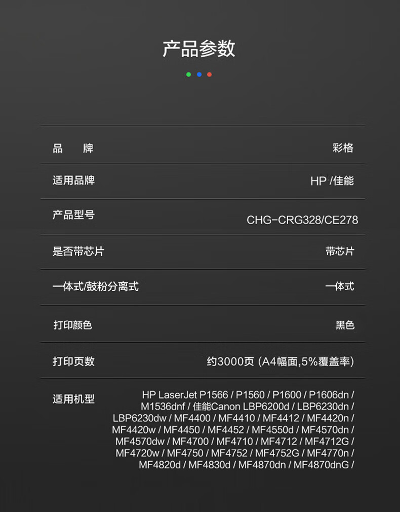 商品属性 [供应商] 德致商成集团有限公司 [打印页数] 3000页 [是否可加粉] 不可加粉 [原装/通用] 通用耗材 [包装清单] 黑色硒鼓Max版(1支) [类别] 一体式硒鼓 [适用机型] 佳能MF4410 4450 4712 4752 4700 惠普HP P1560 P1566 P1606dn M1536dnf 78A