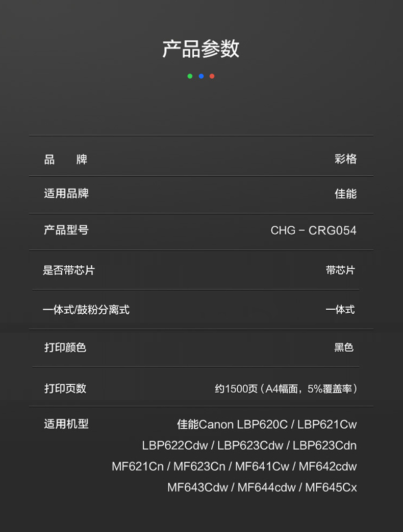 商品属性 [供应商] 科力普科技集团股份有限公司 [适用机型] 佳能Canon LBP620C/LBP621CW LBP622Cdw/LBP623Cdw/LBP623Cdn MF621Cn/MF623Cn/MF641CW/MF642cdw MF643Cdw/MF644cdw/MF645Cx [商品毛重] 0.708kg [打印量] 1500页 [品牌] 彩格 [型号] CHG-CRG054