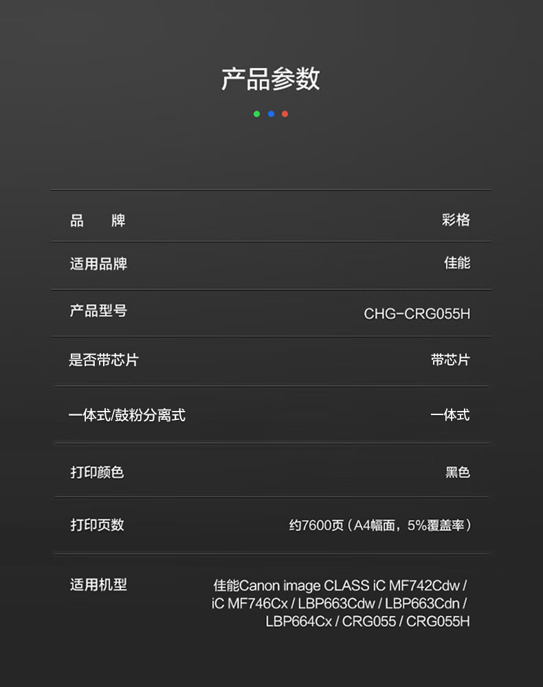 商品属性 [供应商] 德致商成集团有限公司 [打印页数] 7600页 [是否可加粉] 不可加粉 [原装/通用] 通用耗材 [类别] 一体式硒鼓 [适用机型] 适用佳能mf742cdw mf746cx lbp663cdw lbp663cdn