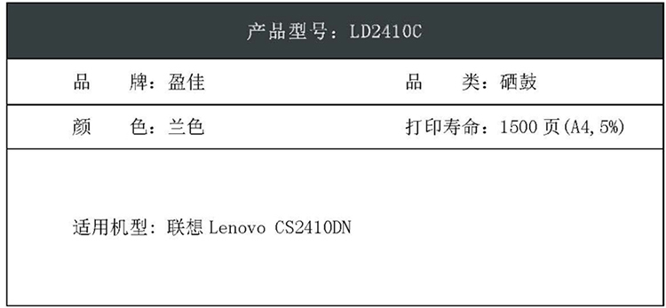 商品属性 [供应商] 深圳市怡亚通供应链股份有限公司 [品牌:] 盈佳(Ink Cartridge) [型号:] LD2410C [规格:] 商专版带芯片1500页