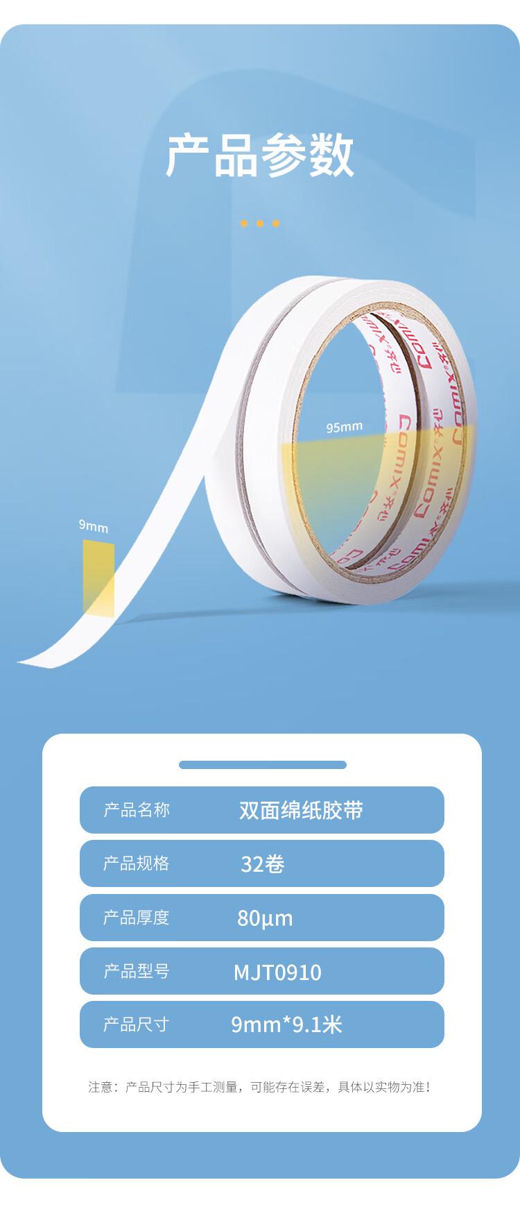 商品属性 [供应商] 深圳市怡亚通供应链股份有限公司 [品牌:] 齐心(COMIX) [型号:] MJT0910 [规格:] 9mm*9.1m 32卷/筒