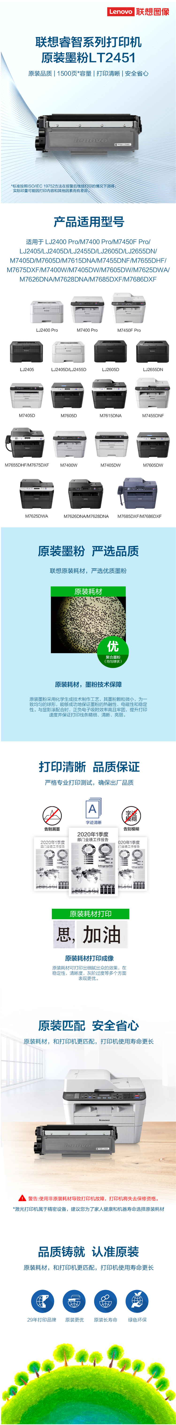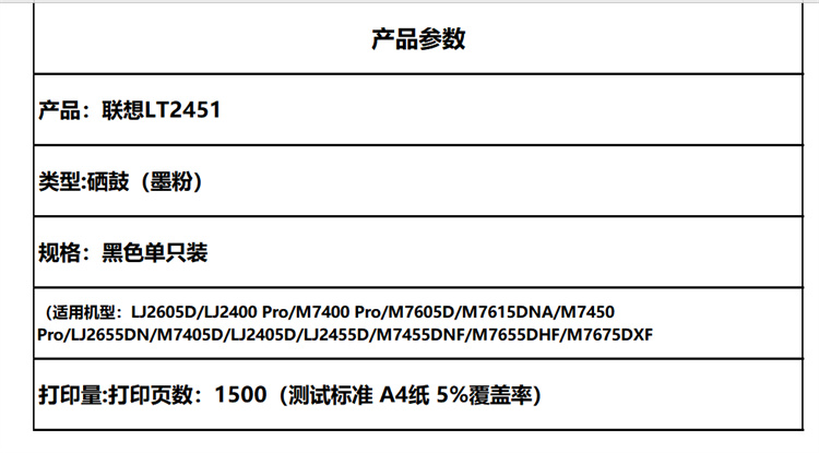 商品属性 [供应商] 得力集团有限公司 [品牌] 联想(Lenovo) [型号] lT2451 [商品标题] 联想lLT2451原装粉盒(鼓粉分离)黑色单支装(单位:支)打印页数:1500页 [销售单位] 支