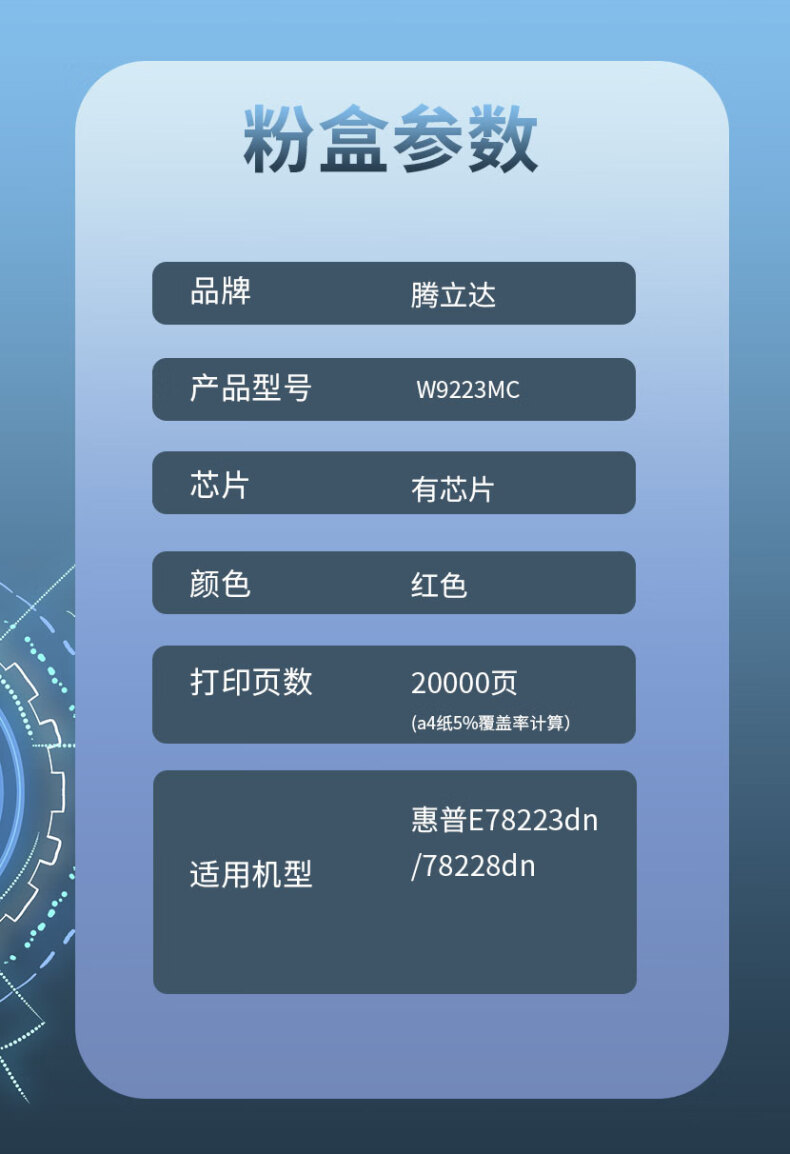 商品属性 [供应商] 得力集团有限公司 [品牌] 腾立达 [型号] W9220MC [商品标题] 腾立达W9220MC粉盒 红色 适用机型:惠普E78223dn/78228dn (单位:个) [销售单位] 个