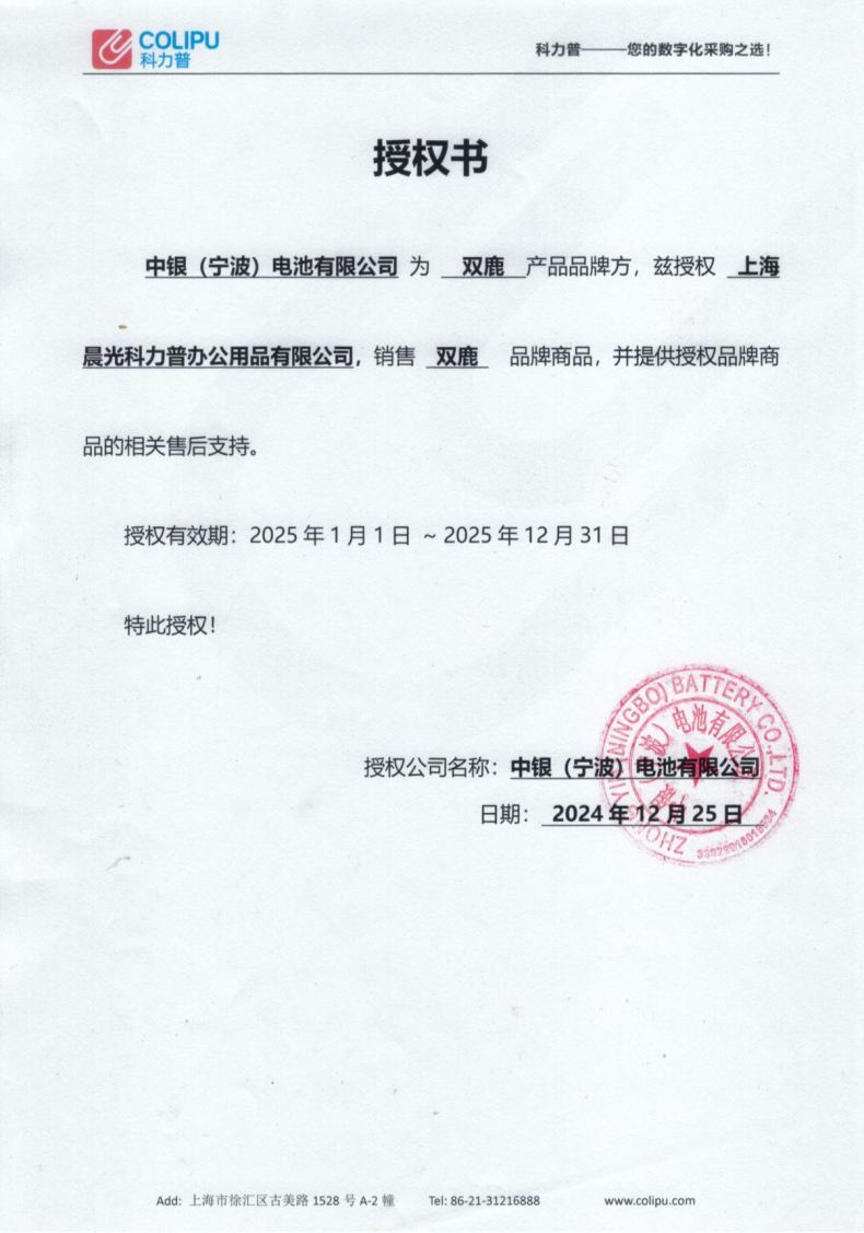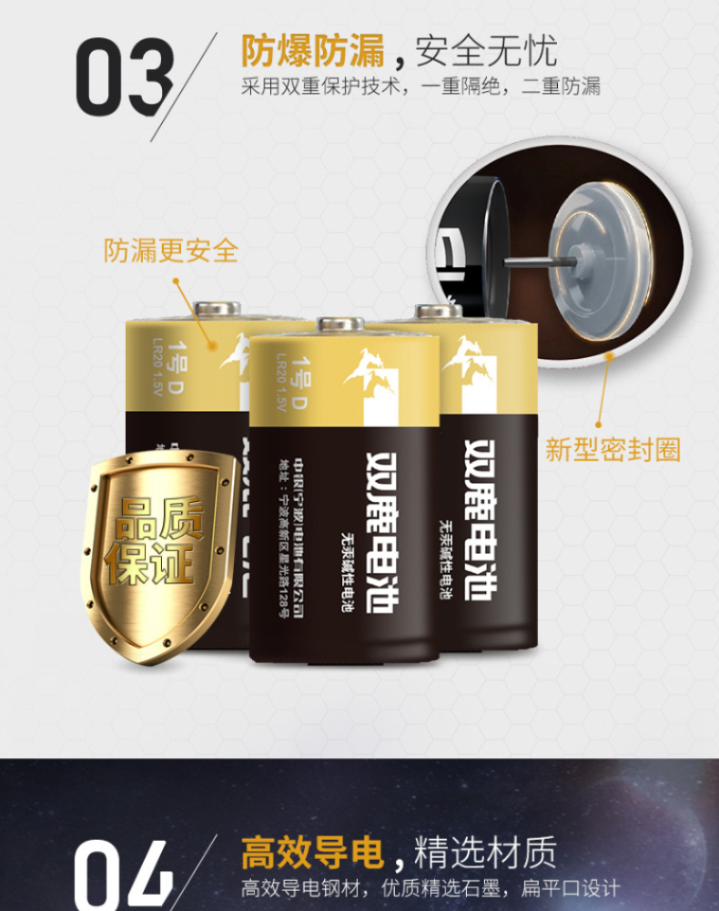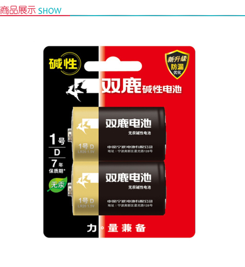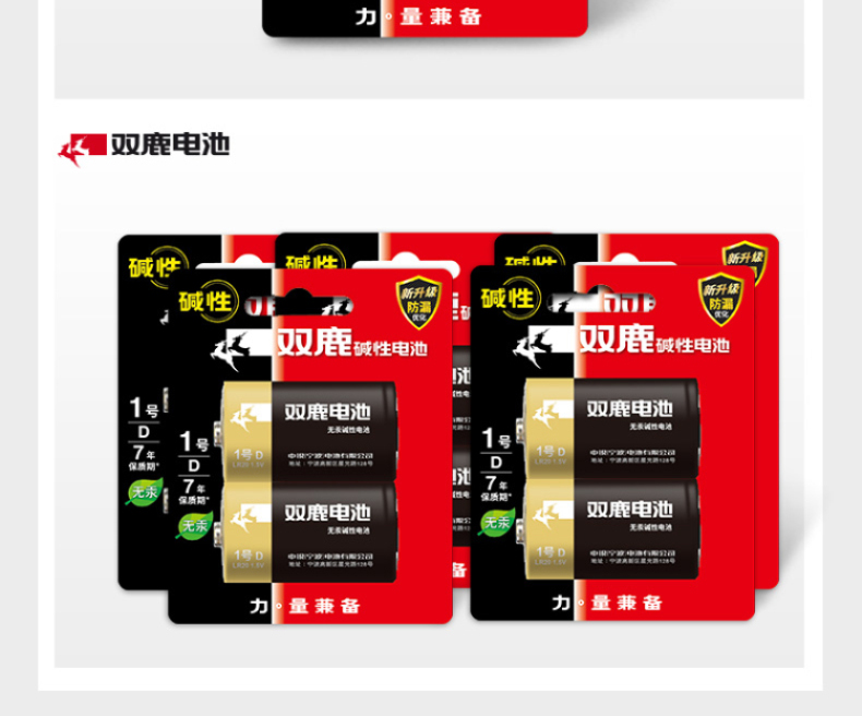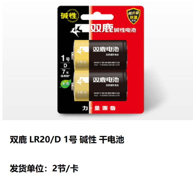 商品属性 [供应商] 科力普科技集团股份有限公司 [电池容量] 无 [电池型号] LR20 [电池类型] 碱性电池 [是否可充电] 否 [保质期] 7年 [电压] 1.5V [包装规格] 1.5V 2节/卡 [品牌] 双鹿 [型号] LR20 [内包装] 2节/卡 10卡/盒 6盒/箱