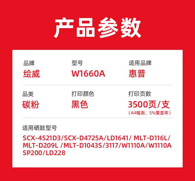 商品属性 [供应商] 深圳市怡亚通供应链股份有限公司 [品牌:] 绘威 [型号:] W1660A [规格:] 打印页数7000页