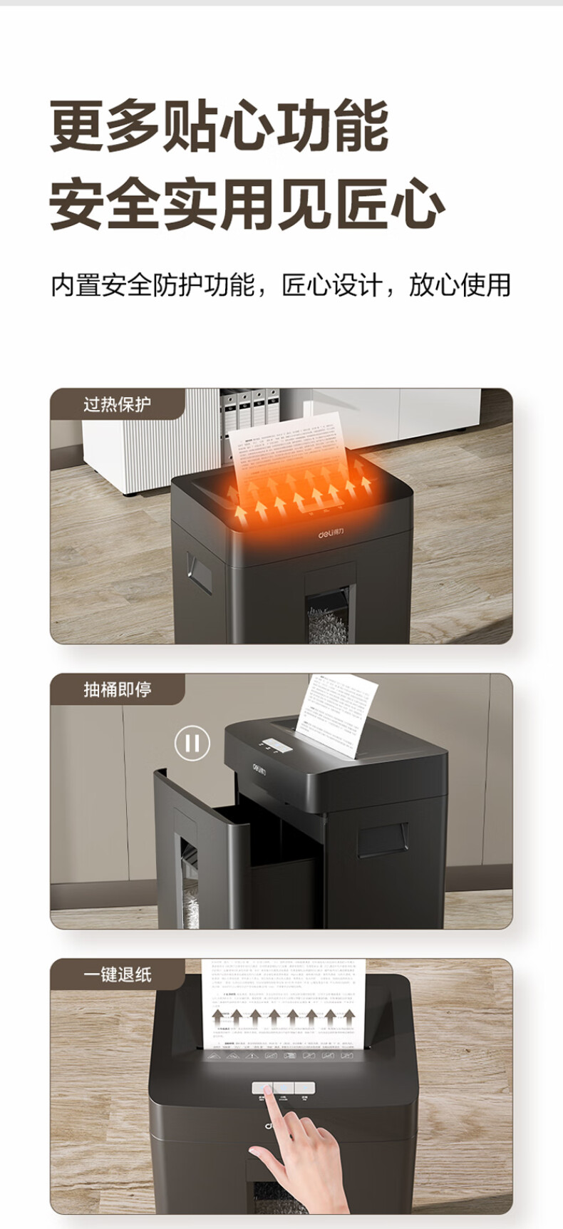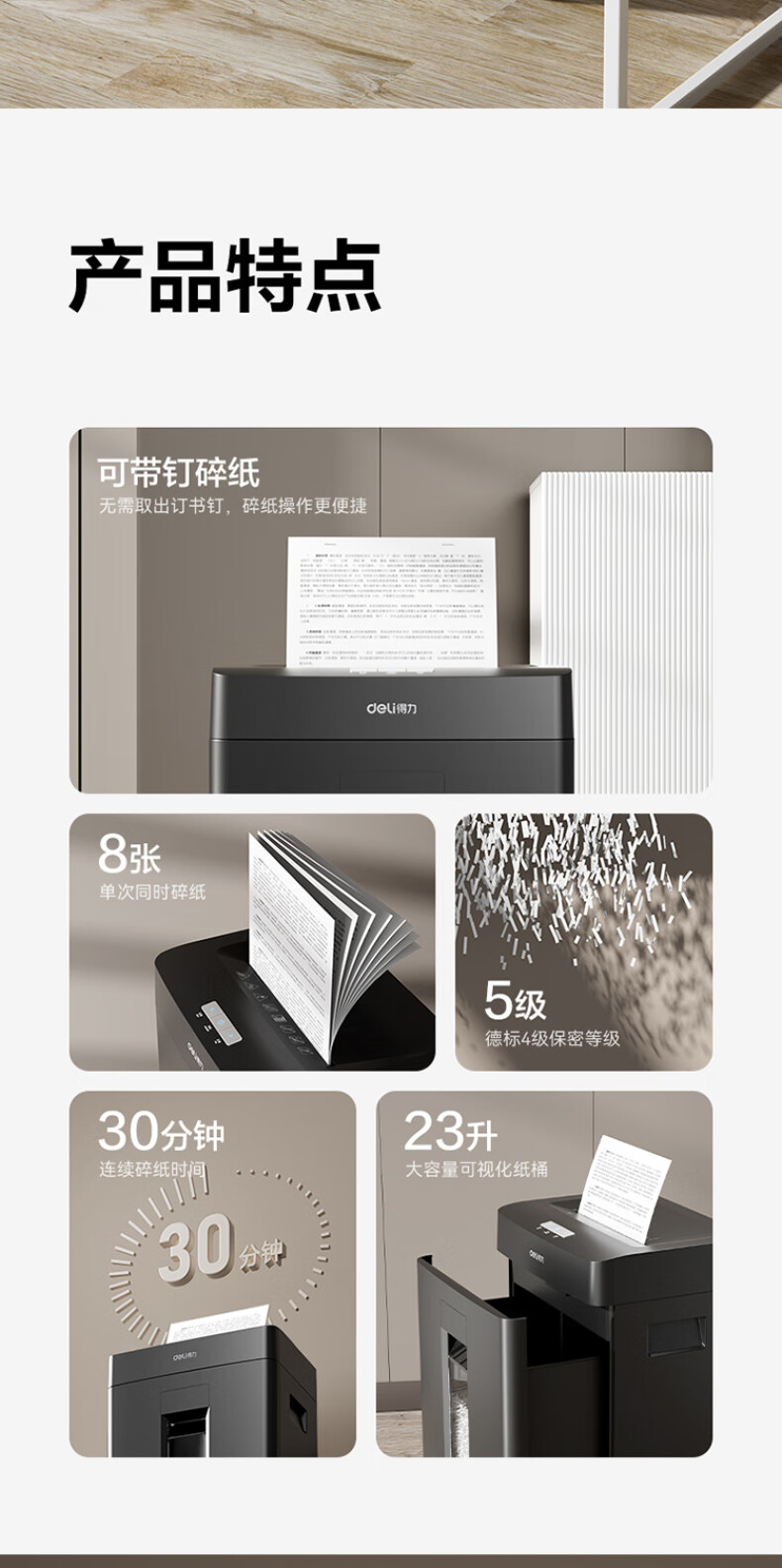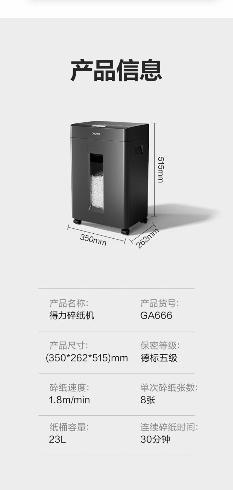 商品属性 [供应商] 得力集团有限公司 [品牌] 得力(DELI) [型号] GA666 [保密等级] 5级保密 [纸桶容量] 23L