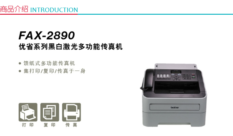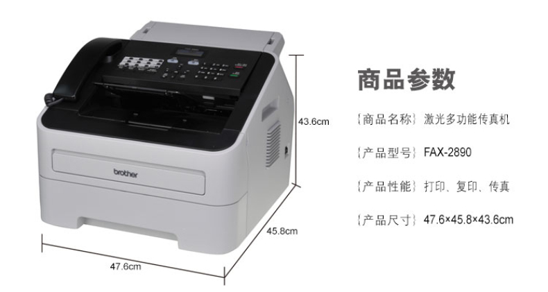 商品属性 [供应商] 科力普科技集团股份有限公司 [自动送稿] 支持 [分辨率] 600x600dpi [文稿尺寸] A4 [调制解调器速度] 14.4kbps [传送速度] 约2.5秒/页 [品牌] 兄弟 [型号] FAX-2890