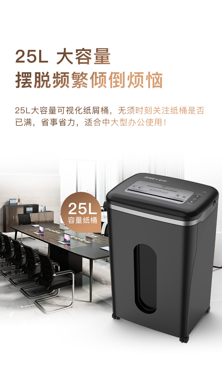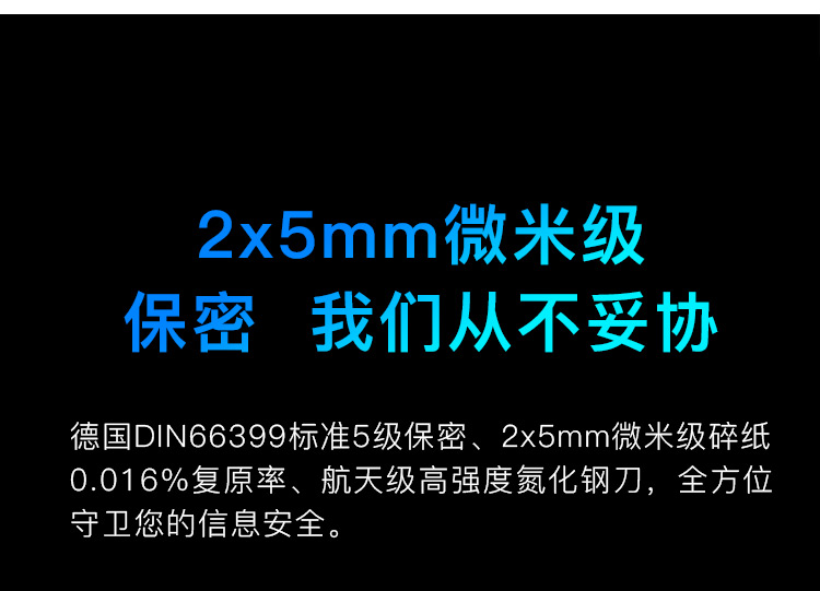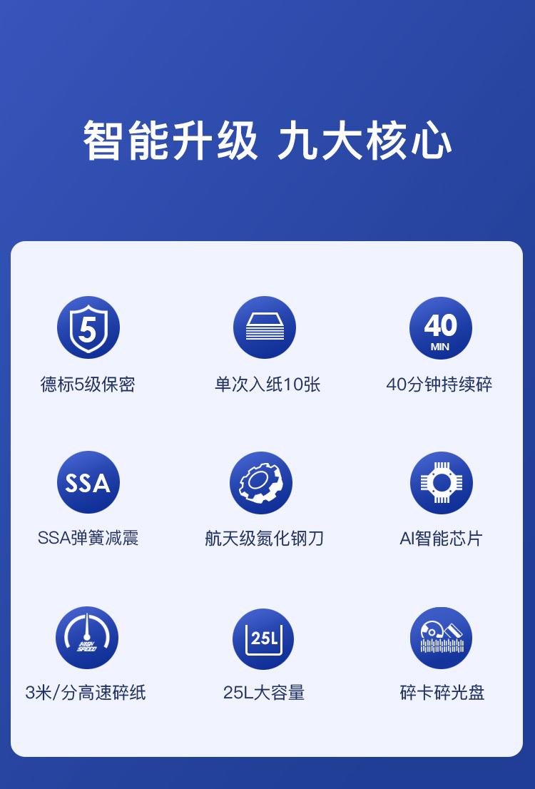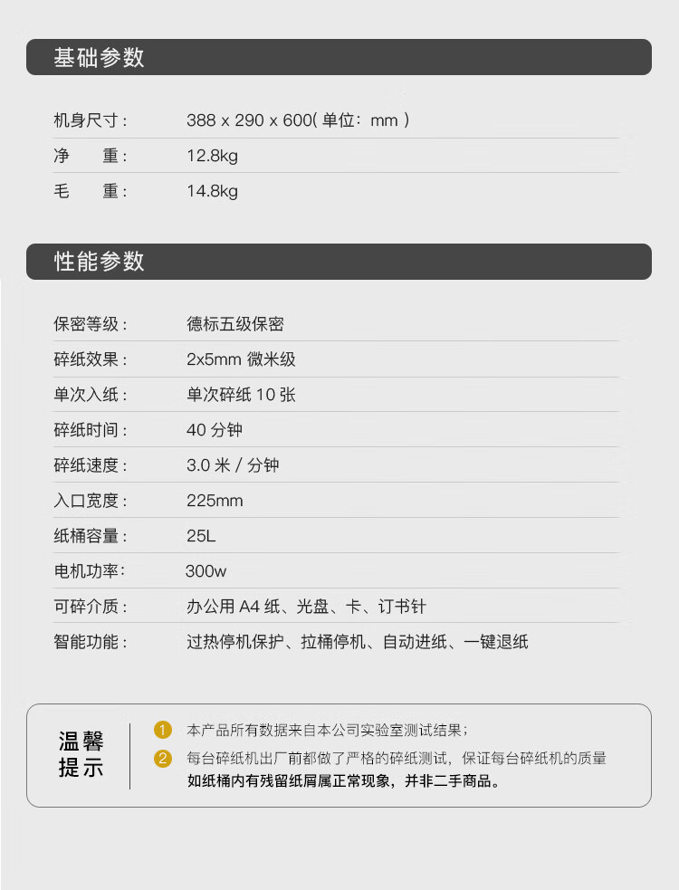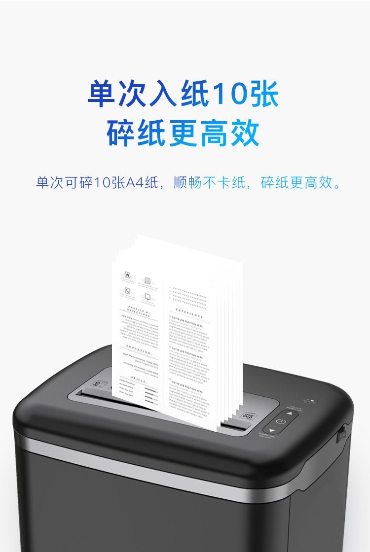 商品属性 [供应商] 德致商成集团有限公司 [最大碎纸幅面] A4 [保密等级] 5级 [单次碎纸张数] 10张 [纸箱容量] 25L