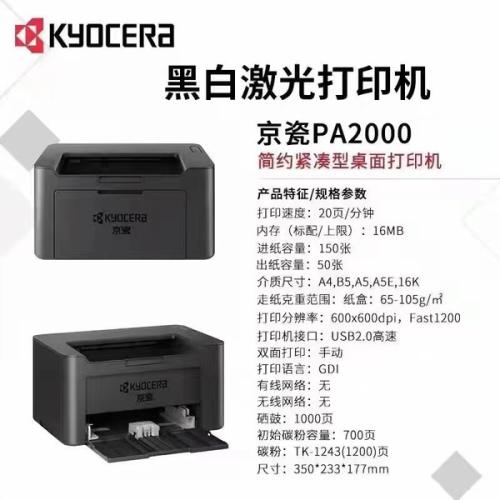 商品属性 [供应商] 上海邮乐网络技术有限公司 [属性名称] 属性值 [产品品牌] 京瓷 [产品型号] PA2000 [打印速度] 20页/分钟 [内存(标配/上限)] 16MB [进纸容量] 150张 [出纸容量] 50张 [介质尺寸] A4,B5,A5,A5E,16K [走纸克重范围] 纸盒:65-105g/㎡ [打印分辨率] 600x600dpi,Fast1200 [打印机接口] USB2.0高速 [双面打印] 手动 [打印语言] GDI [有线网络] 无 [无线网络] 无 [硒鼓] 1000页 [初始碳粉容量] 700页 [碳粉] TK-1243(1200)页 [尺寸] 350*233*177mm