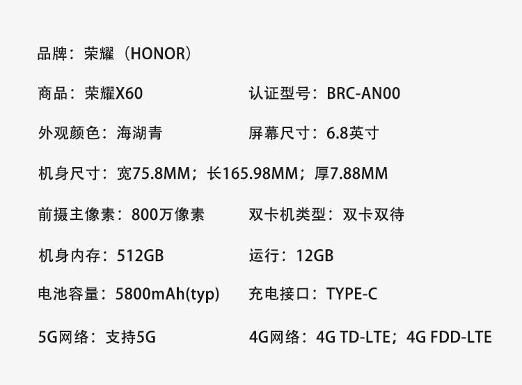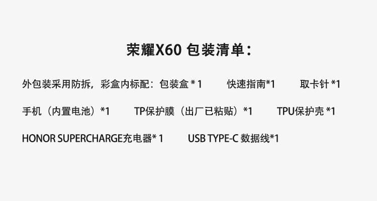 商品属性 [供应商] 深圳市怡亚通供应链股份有限公司 [品牌:] 荣耀(HONOR) [型号:] X60 [规格:] 6.8英寸