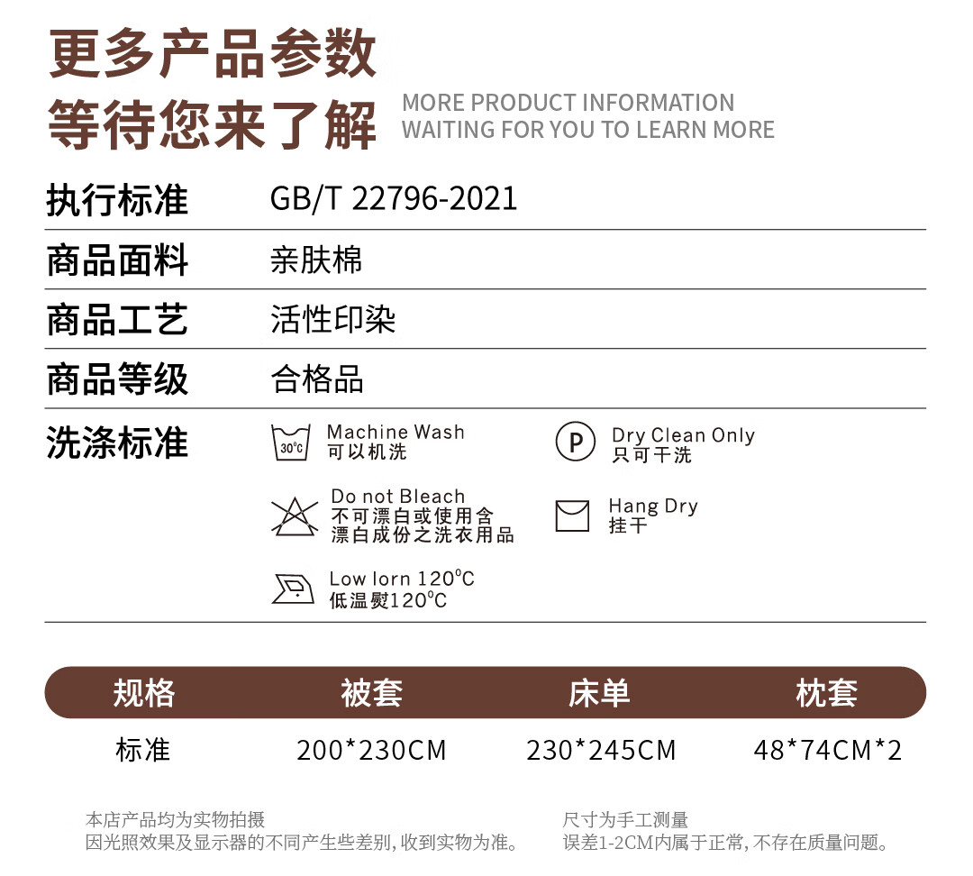 商品属性 [供应商] 德致商成集团有限公司 [枕套尺寸] 48*74cm [被套尺寸] 200*230cm [床单尺寸] 230*245cm [适用人群] 通用 [适用季节] 四季通用 [商品产地] 中国大陆