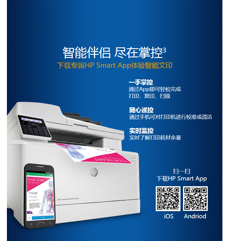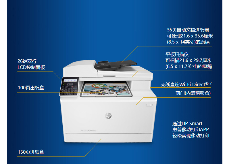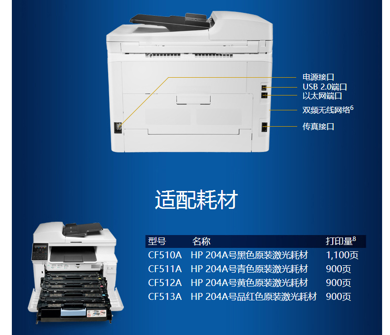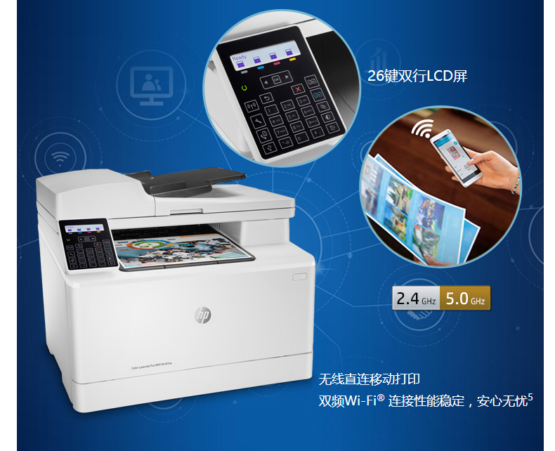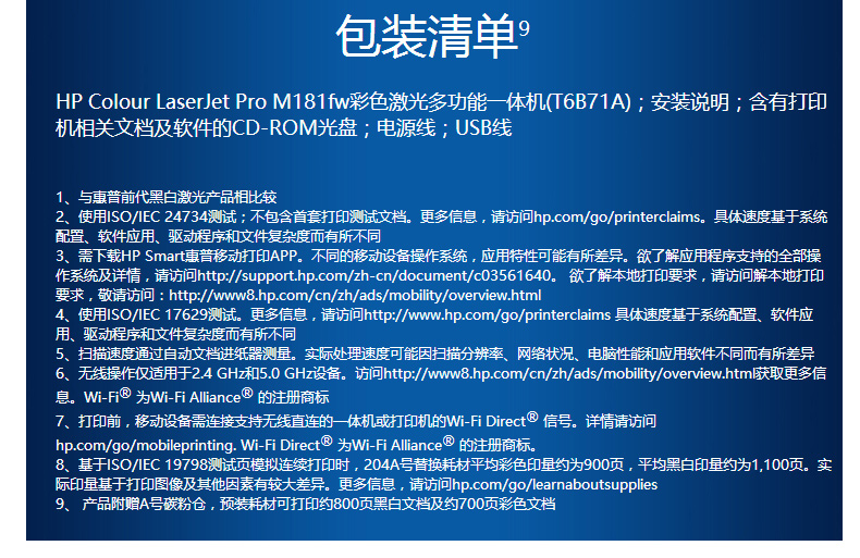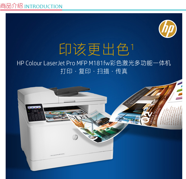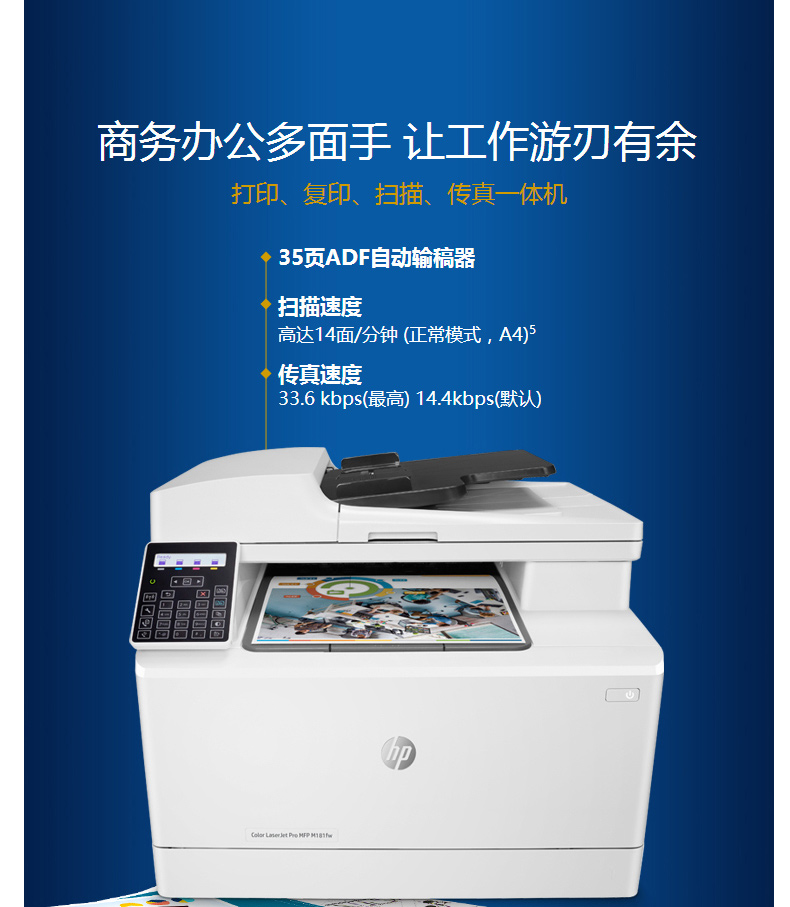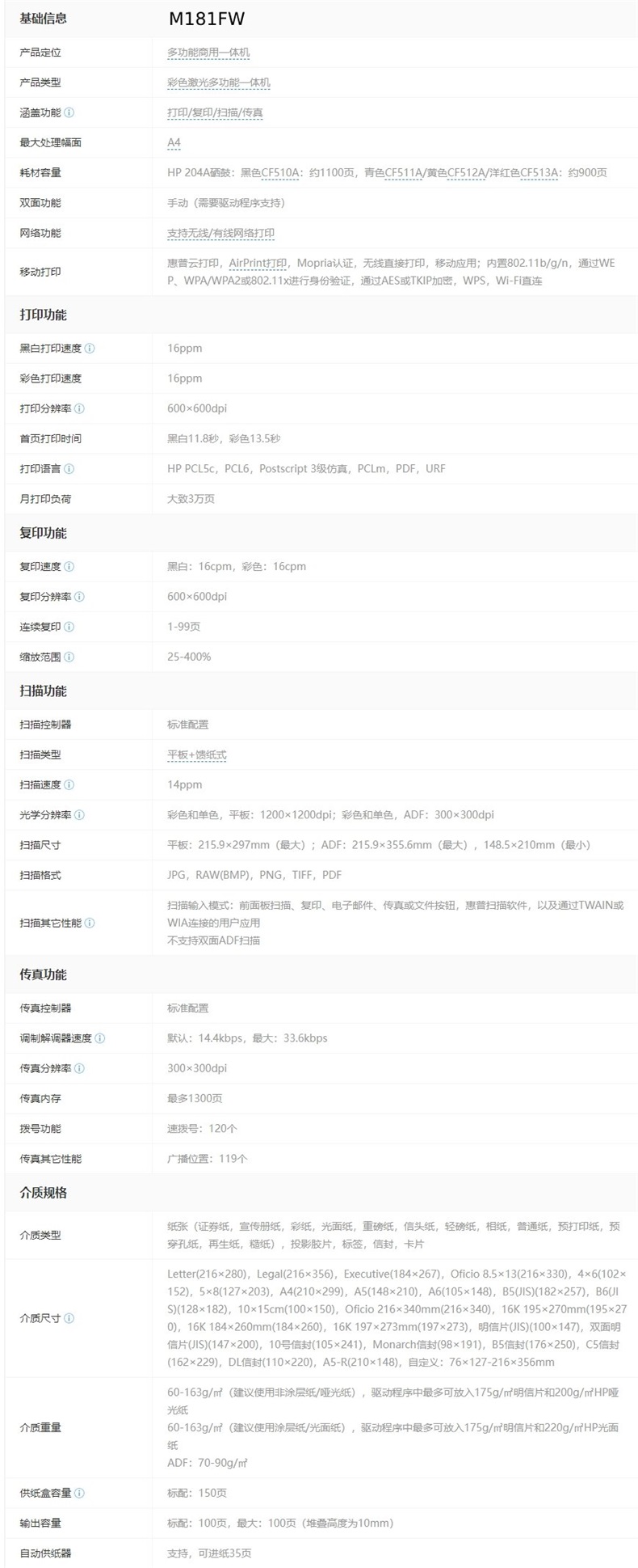 商品属性 [供应商] 科力普科技集团股份有限公司 [幅面] A4 [出纸容量] 100页 [适用硒鼓] / [打印速度] 16页/分钟 [扫描类型] 平板式,ADF [首页打印时间] 黑白11.8秒, [保修] 1年质保 [包装清单] 机器*1、电源线*1、说明书*1、保修卡*1 [进纸容量] 150页 [双面输出] 不支持 [自动送稿器] 标配 [接口类型] USB2.0 [打印负荷] 30000页 [分辨率] 600 x 600 dpi [网络打印] 支持 [扫描速度] 14页/分钟 [复印速度] 16页/分钟 [品牌] 惠普 [型号] M181fw