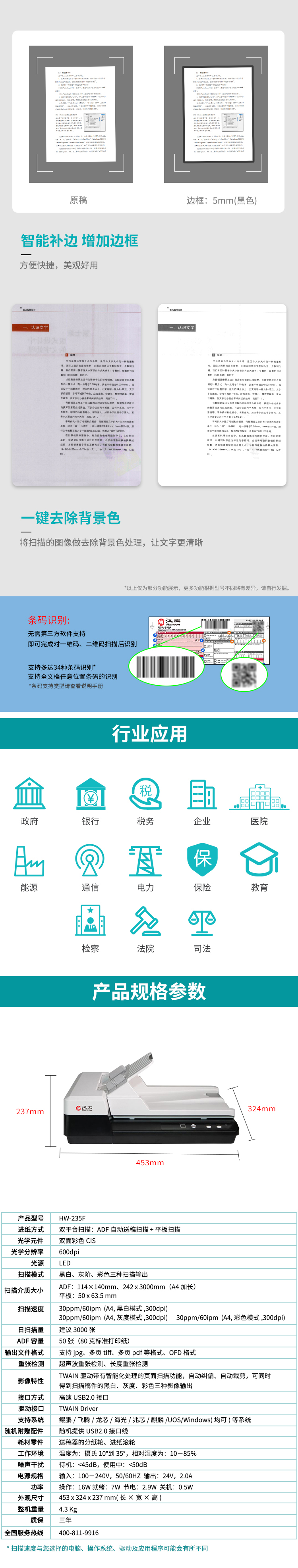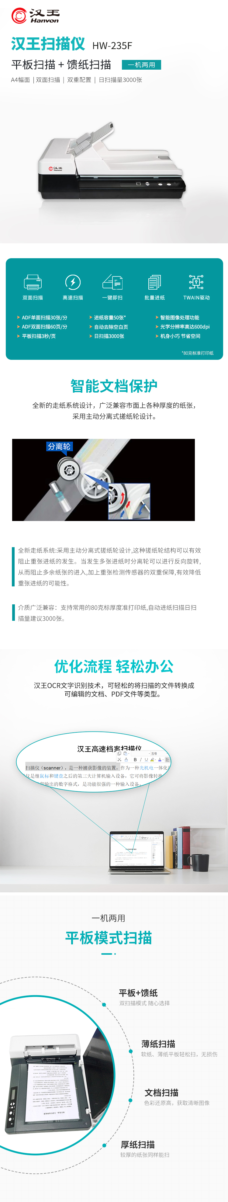商品属性 [供应商] 苏宁易购集团股份有限公司 [产品型号] HW-235F [类型] 扫描仪 [光源类型] LED [产品定位] OA办公 [扫描速度] 30ppm/60ipm [扫描方式] 高速扫描仪 [扫描元件] CIS [一键自动生成双层可检] 支持 [光学分辨率] 1000DPI以下 [幅面尺寸] A4 [接口] 高速USB2.0接口 [分辨率] 600dpi [产地] 中国北京北京市