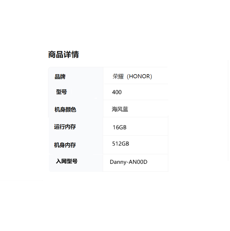 商品属性 [供应商] 深圳市怡亚通供应链股份有限公司 [品牌:] 荣耀(HONOR) [型号:] 400(Danny-AN00D) [规格:] 16GB+512GB